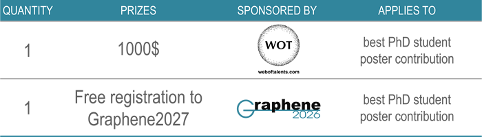 In this edition, the Graphene2026 organisers (in collaboration with several institutions and companies) will offer awards to the best posters presentations. Only PhD students will be eligible to receive awards.